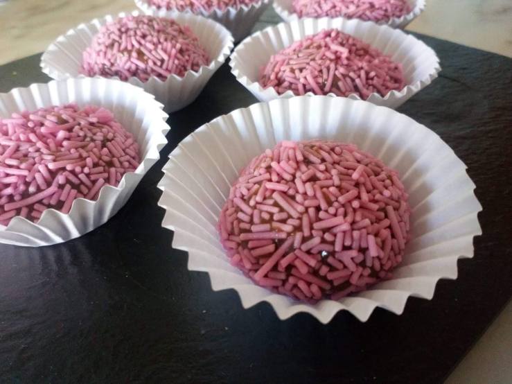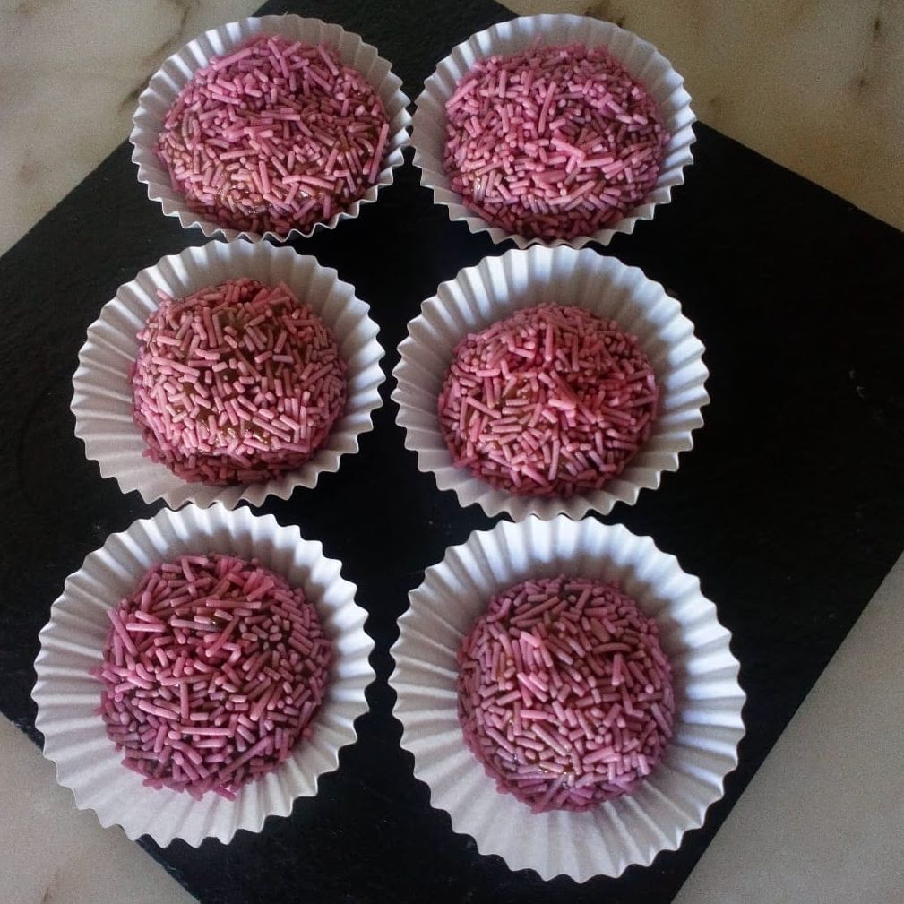 Finalmente passem pelo chocolate granulado, ou coco ralado ou açúcar colorido(…) e coloquem em forminhas de papel frisado.