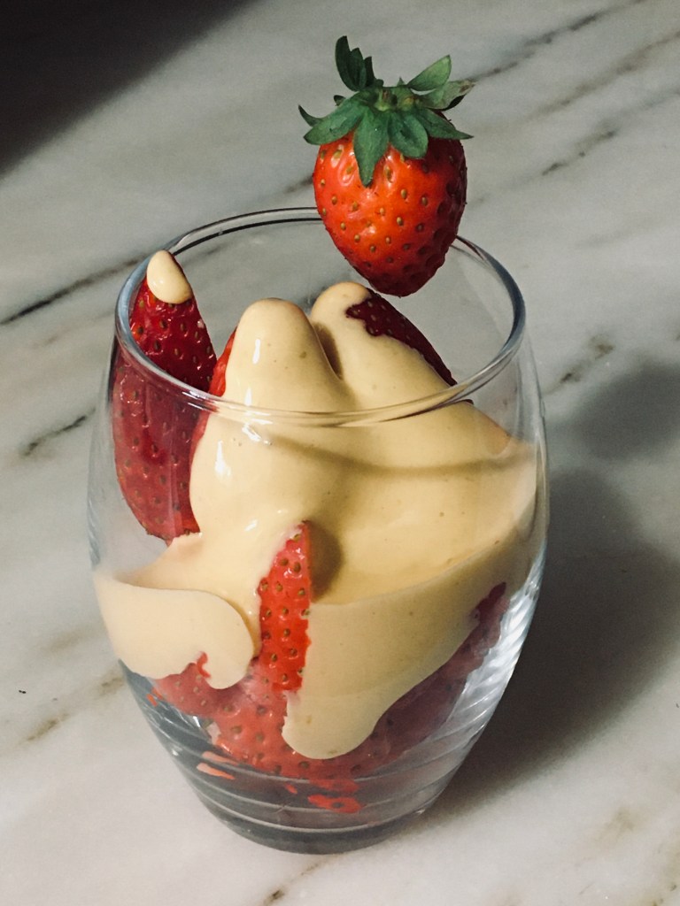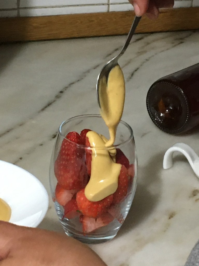 Normalmente acompanho com uma mistura de frutos vermelhos, mas, aproveitando que os morangos estão em época, decidi usa-los nesta receita.